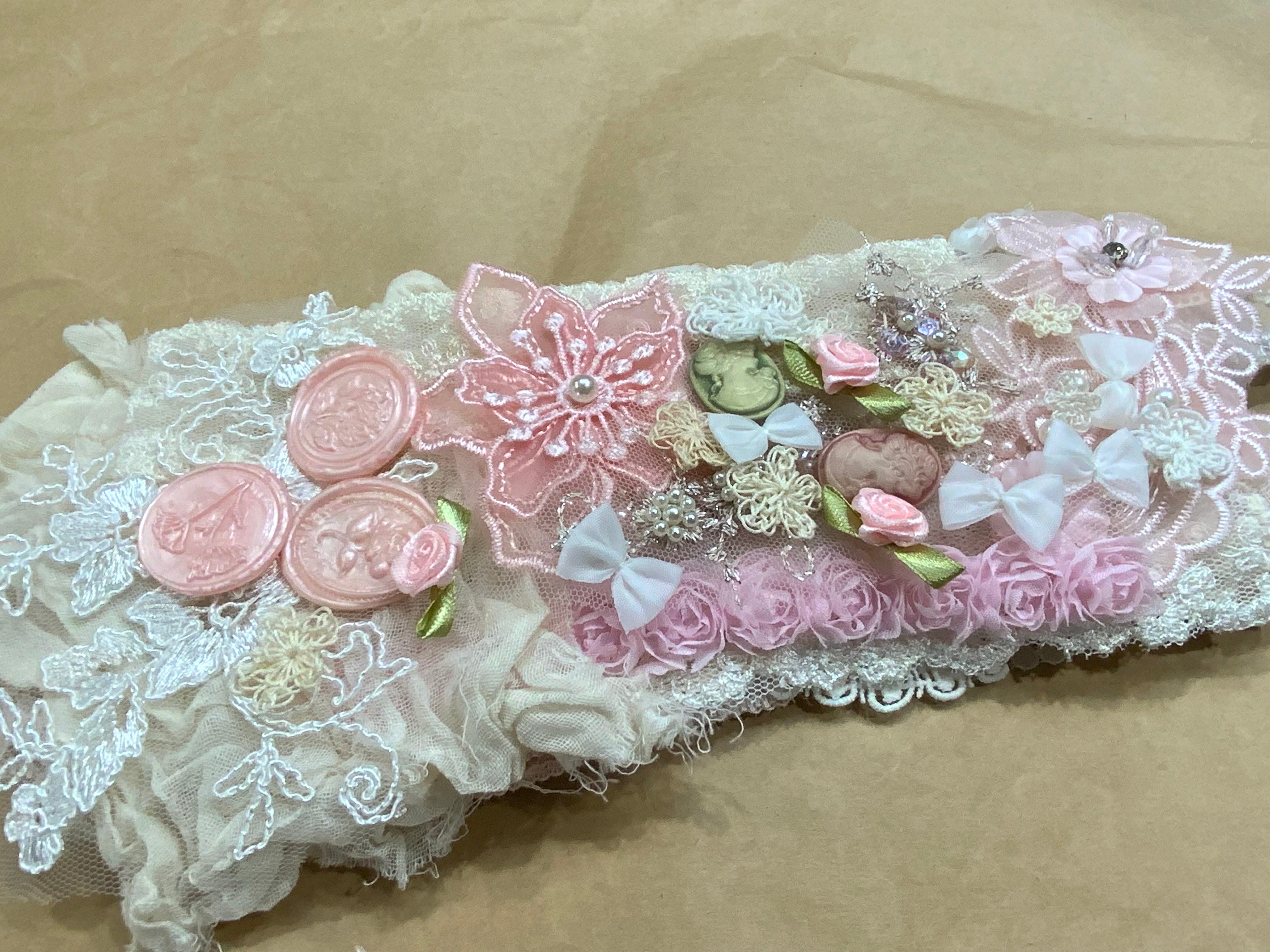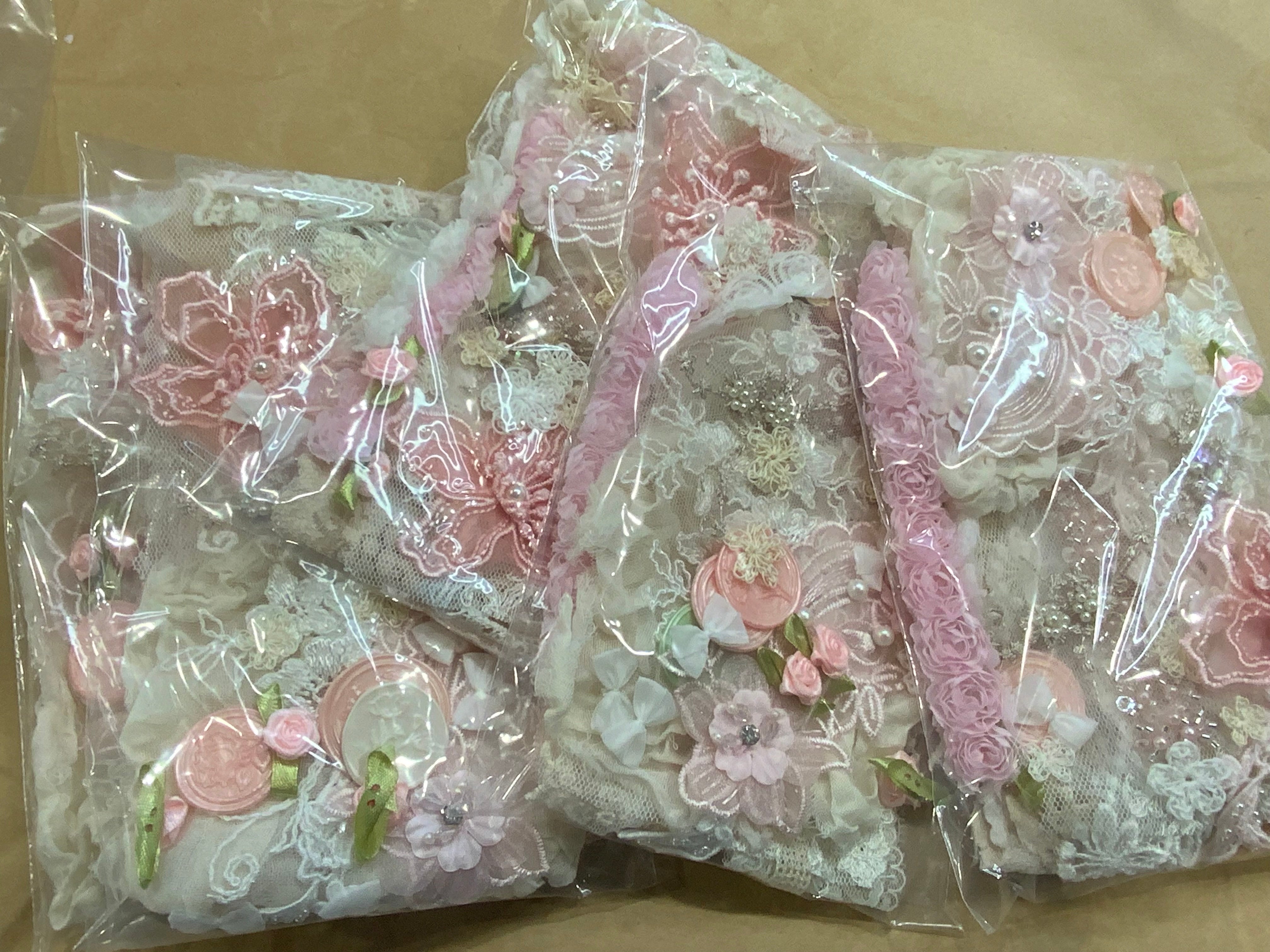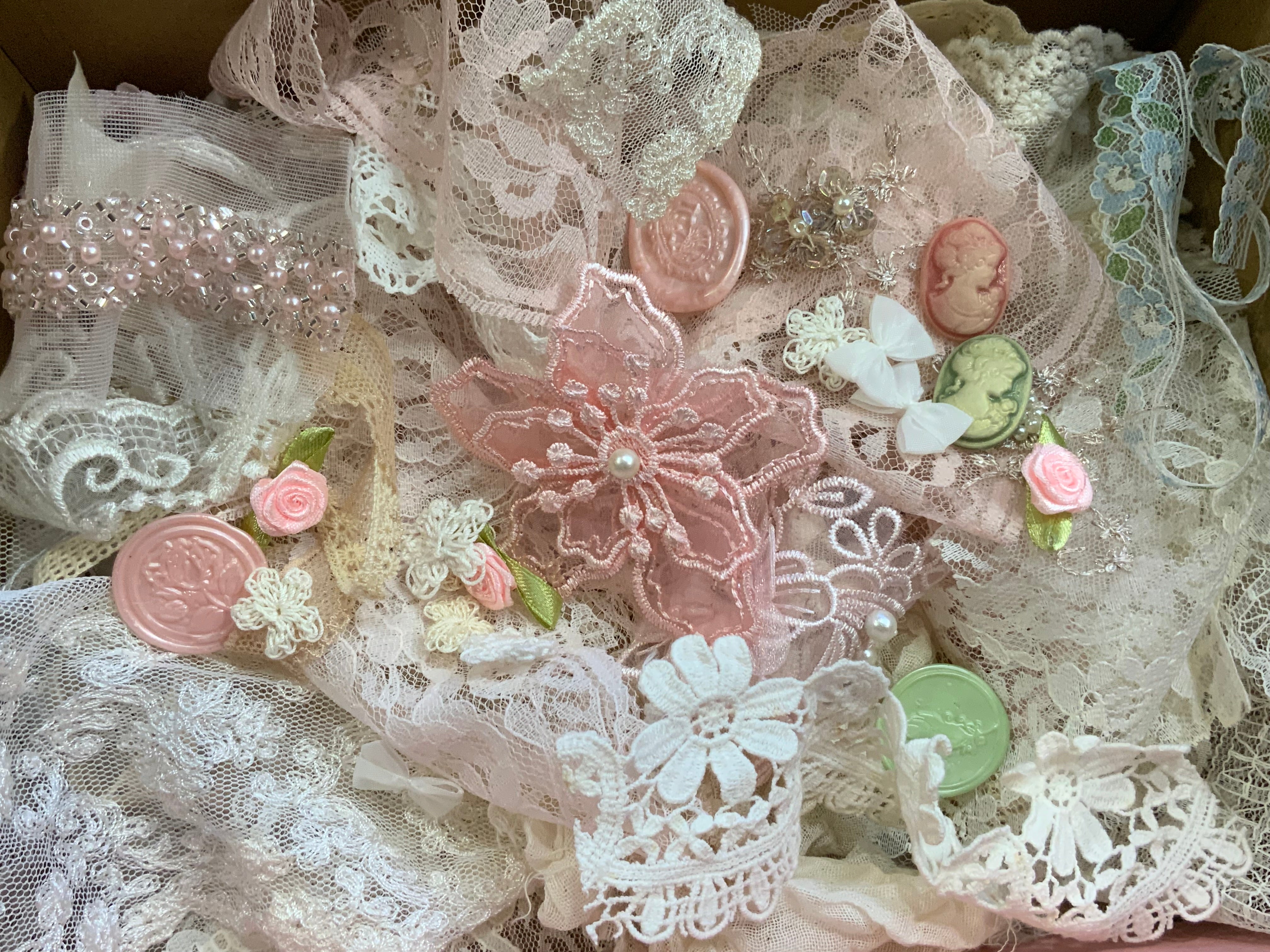 Inside, you’ll find an assortment of vintage laces, trims, beaded appliques, delicate embellishments and handmade wax seals, handmade crocheted flowers.