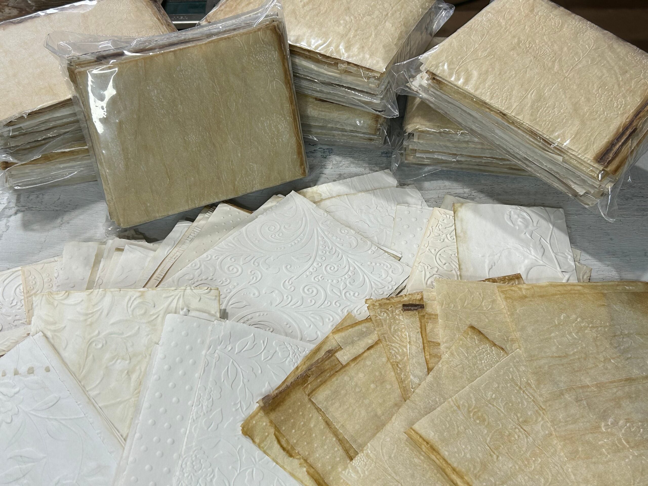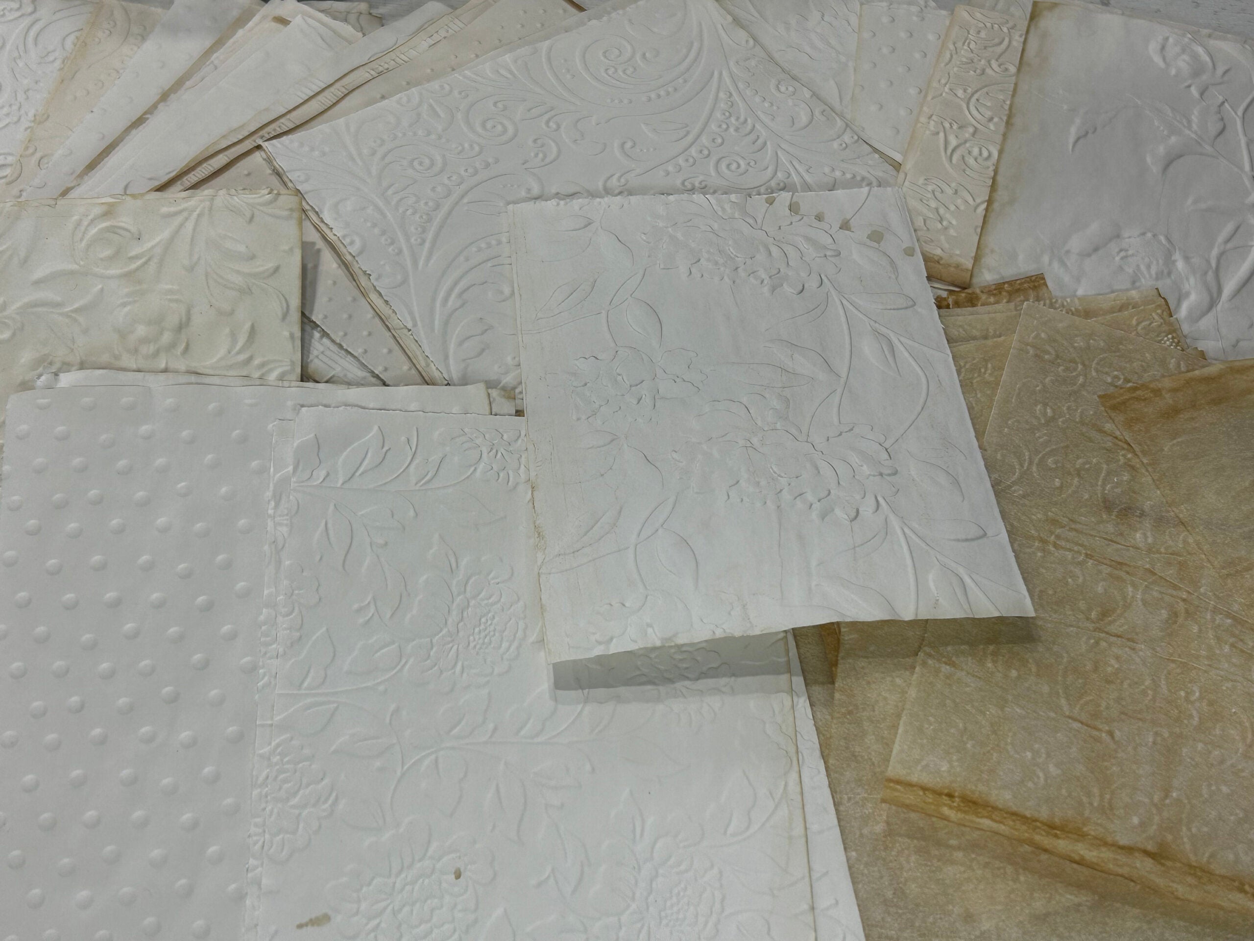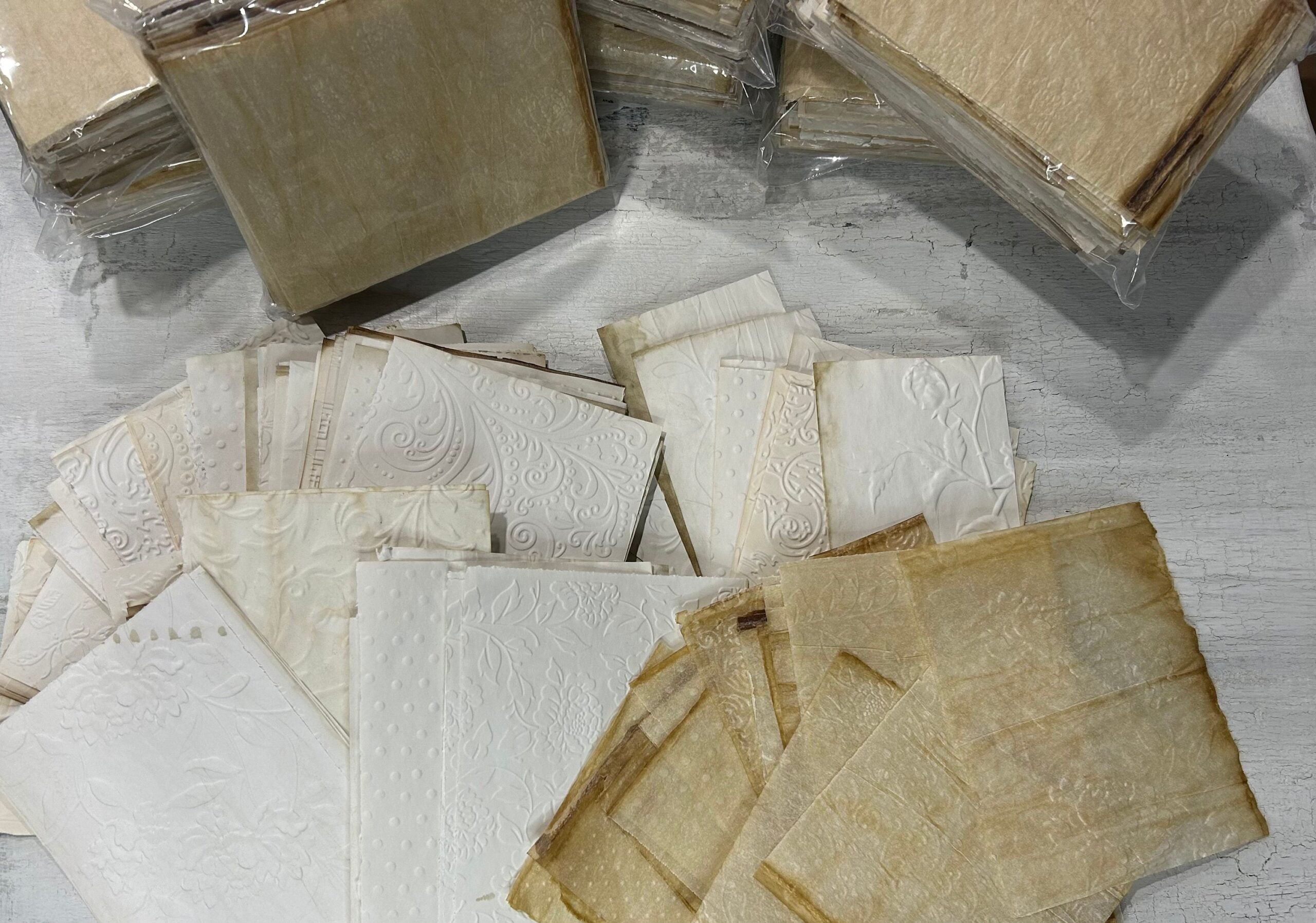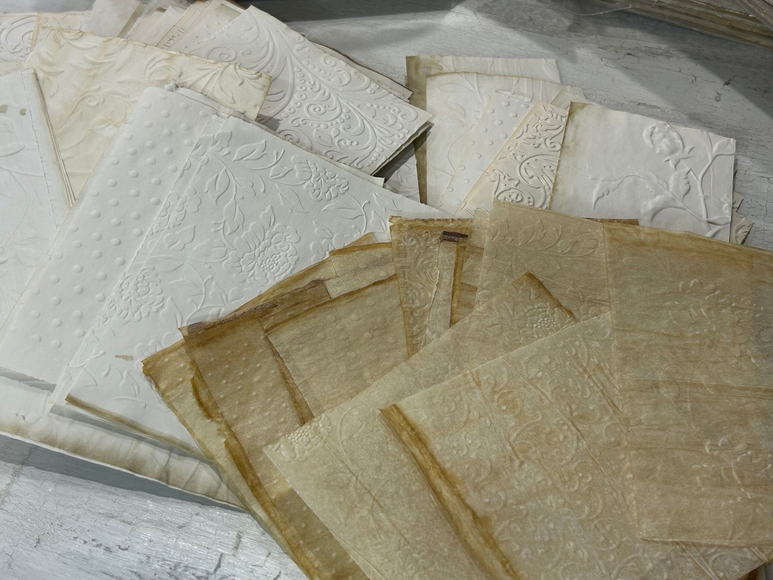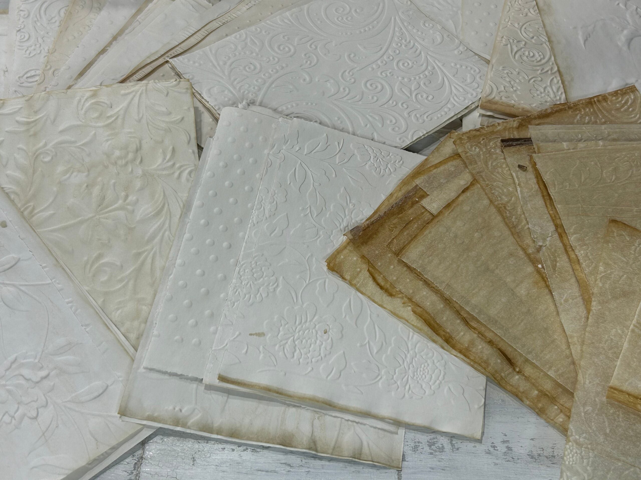 Coffee stained and embossed for you papers and tracing paper bundle. For those of you who do not have the embossing machine and the embossing stencils, after many requests, I am now offering a kit of my favorite embossed designs. The paper is regular copy paper and some tracing paper.