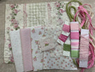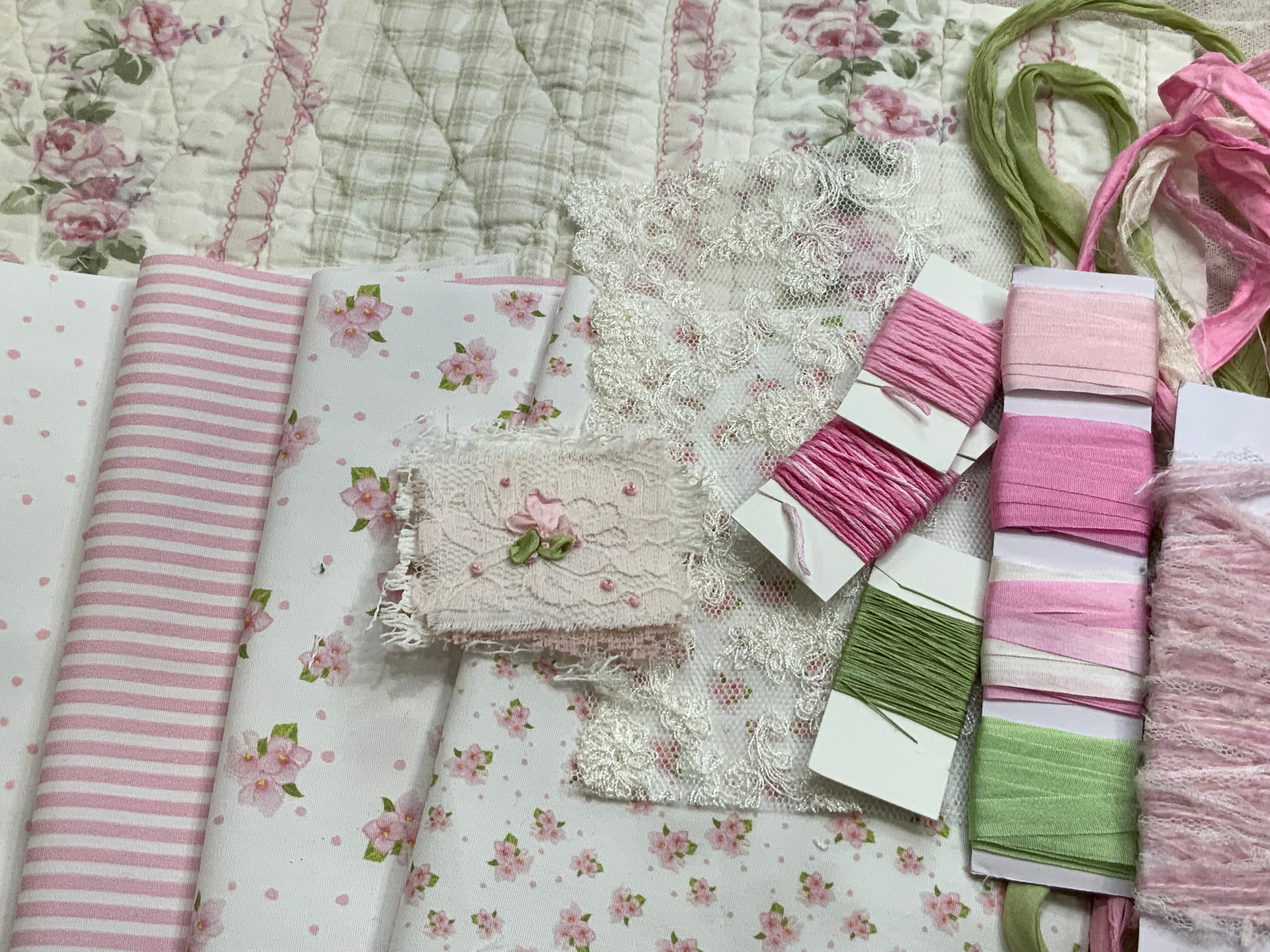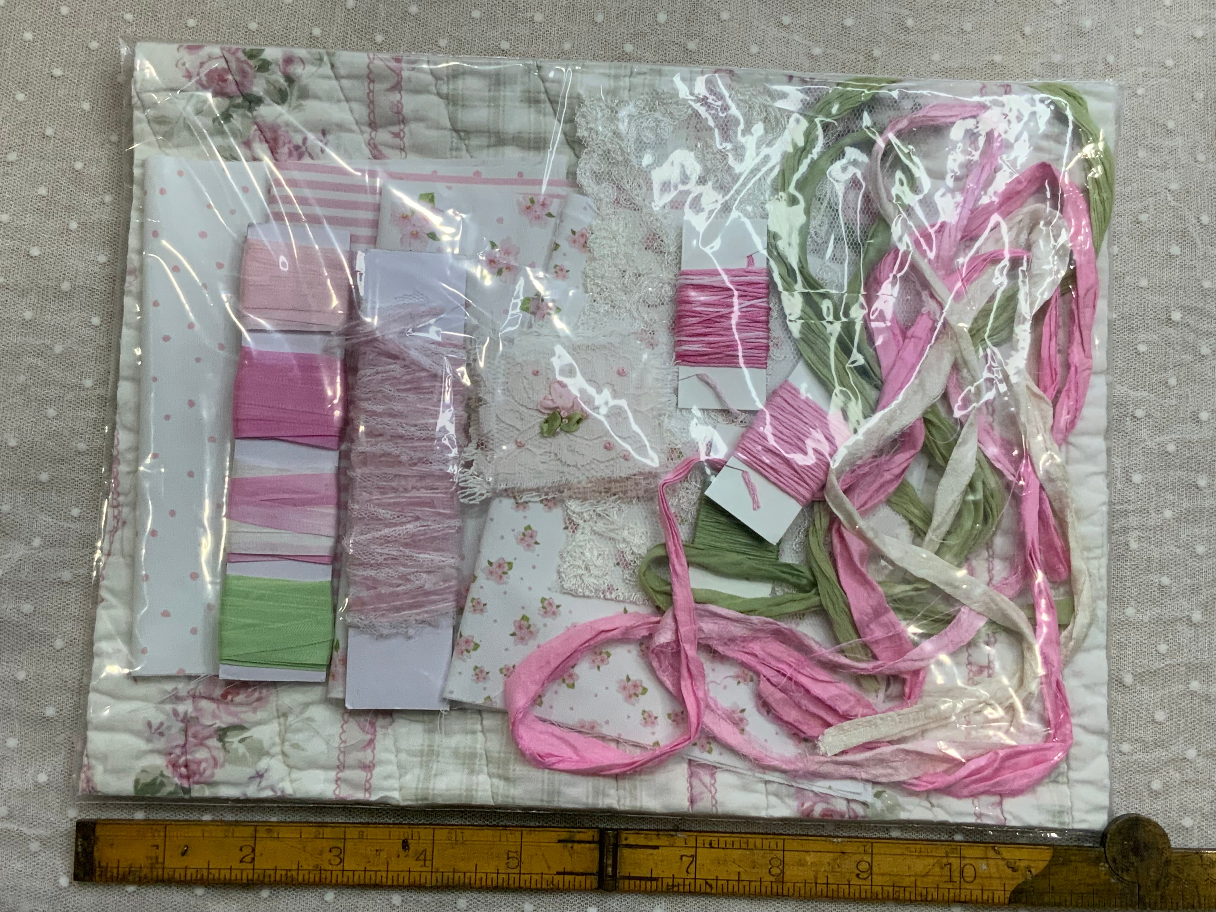 Perfect for beginners or seasoned makers who love to explore, this kit includes a lovely mix of fabric pieces with designs, a vintage piece of quilt, lace, embroidery silk ribbons, and embroidery threads, sari silk, fancy yarns ... all carefully chosen to coordinate beautifully together.