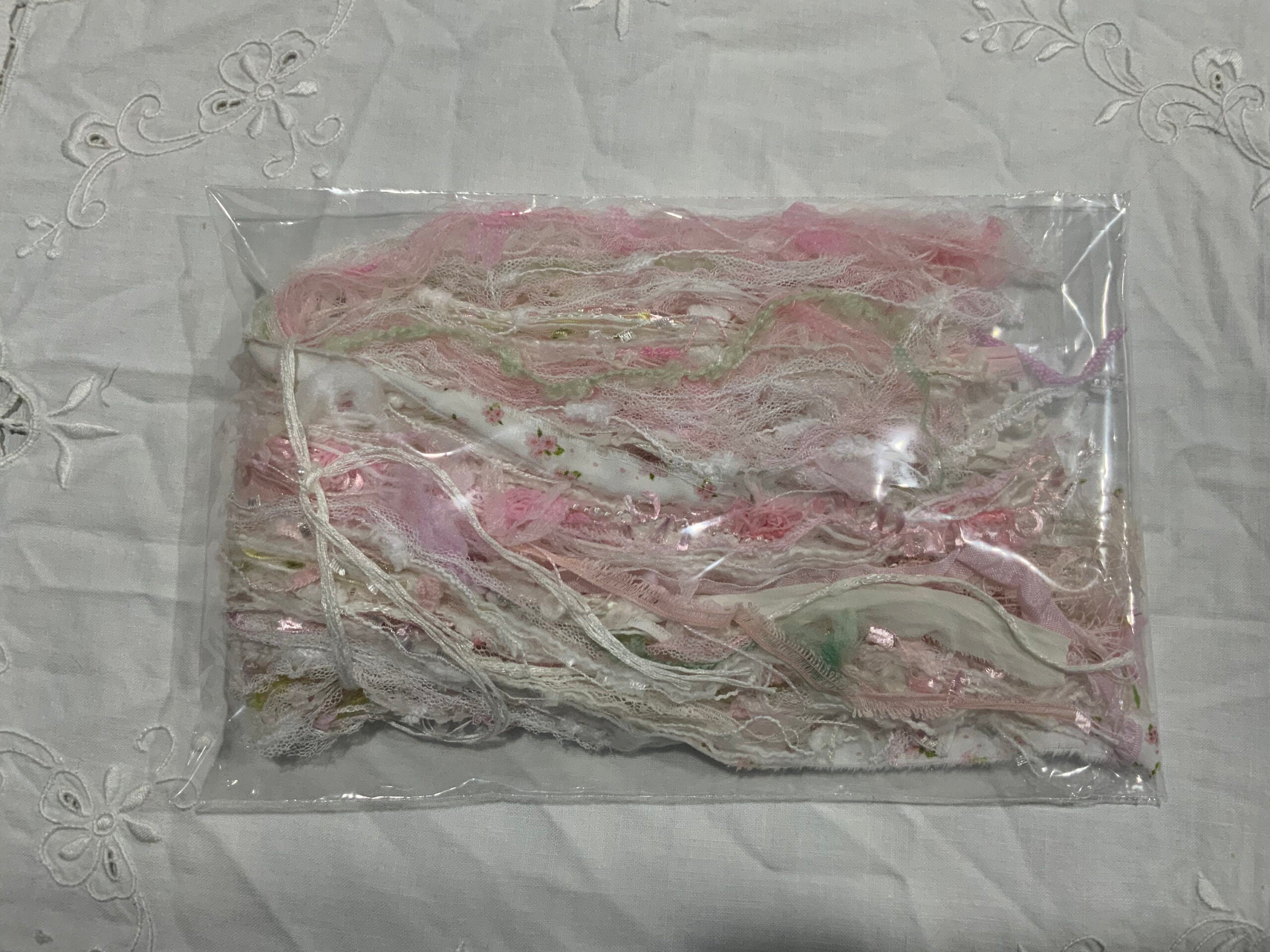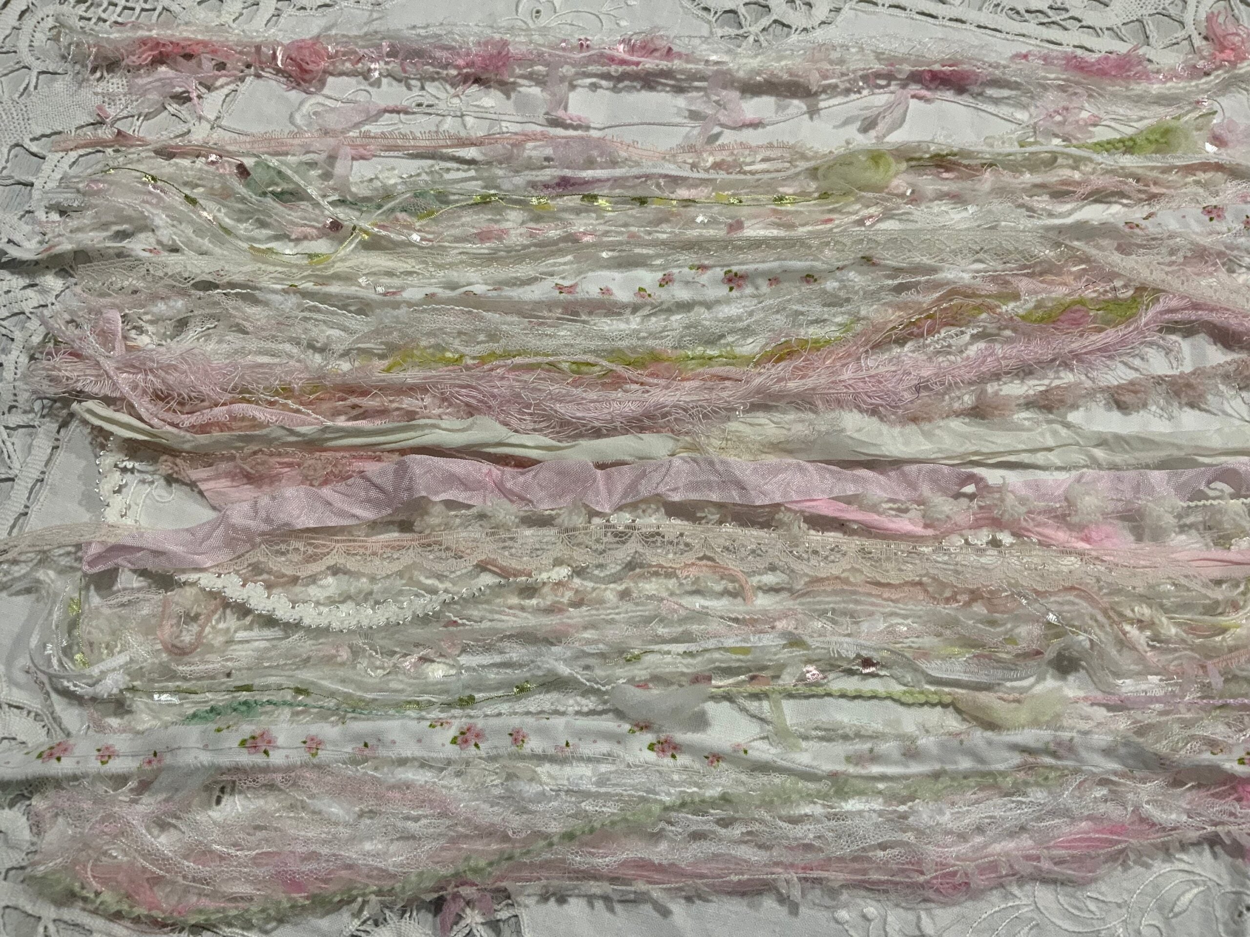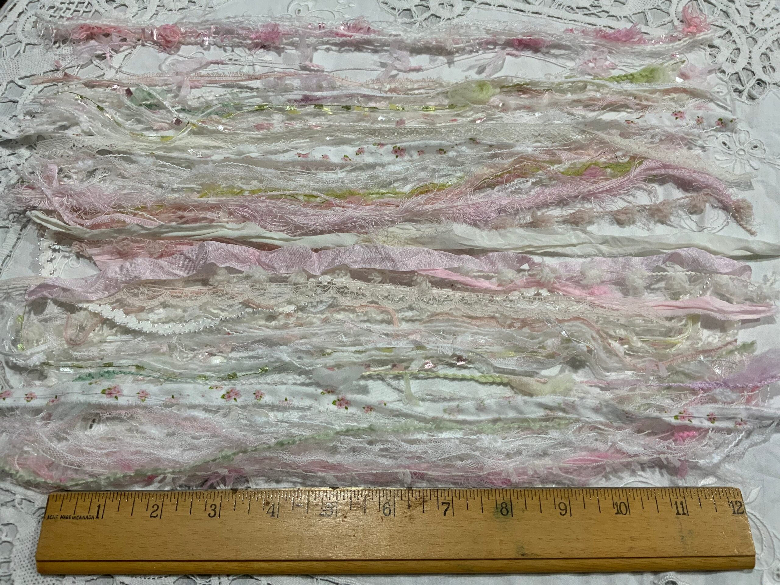 Bundle of fancy yarns, silk/chiffon/fabric/crinkled seam binding - already cut to about 15 inches.