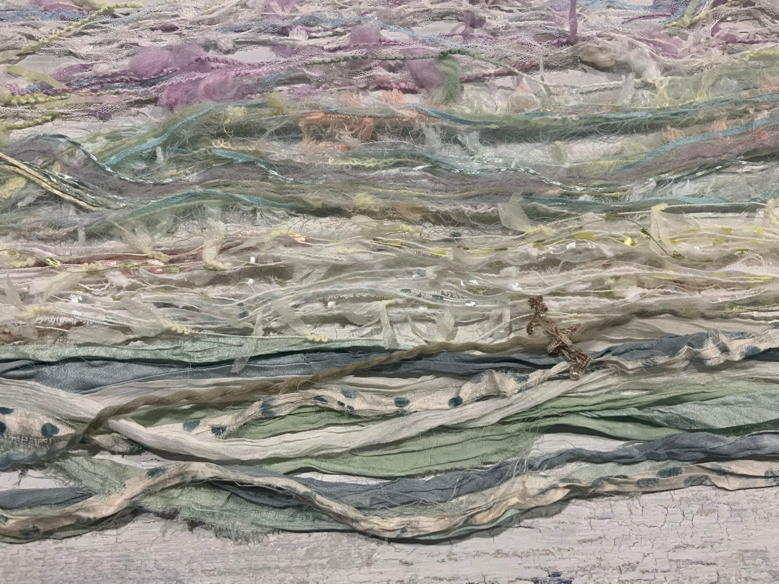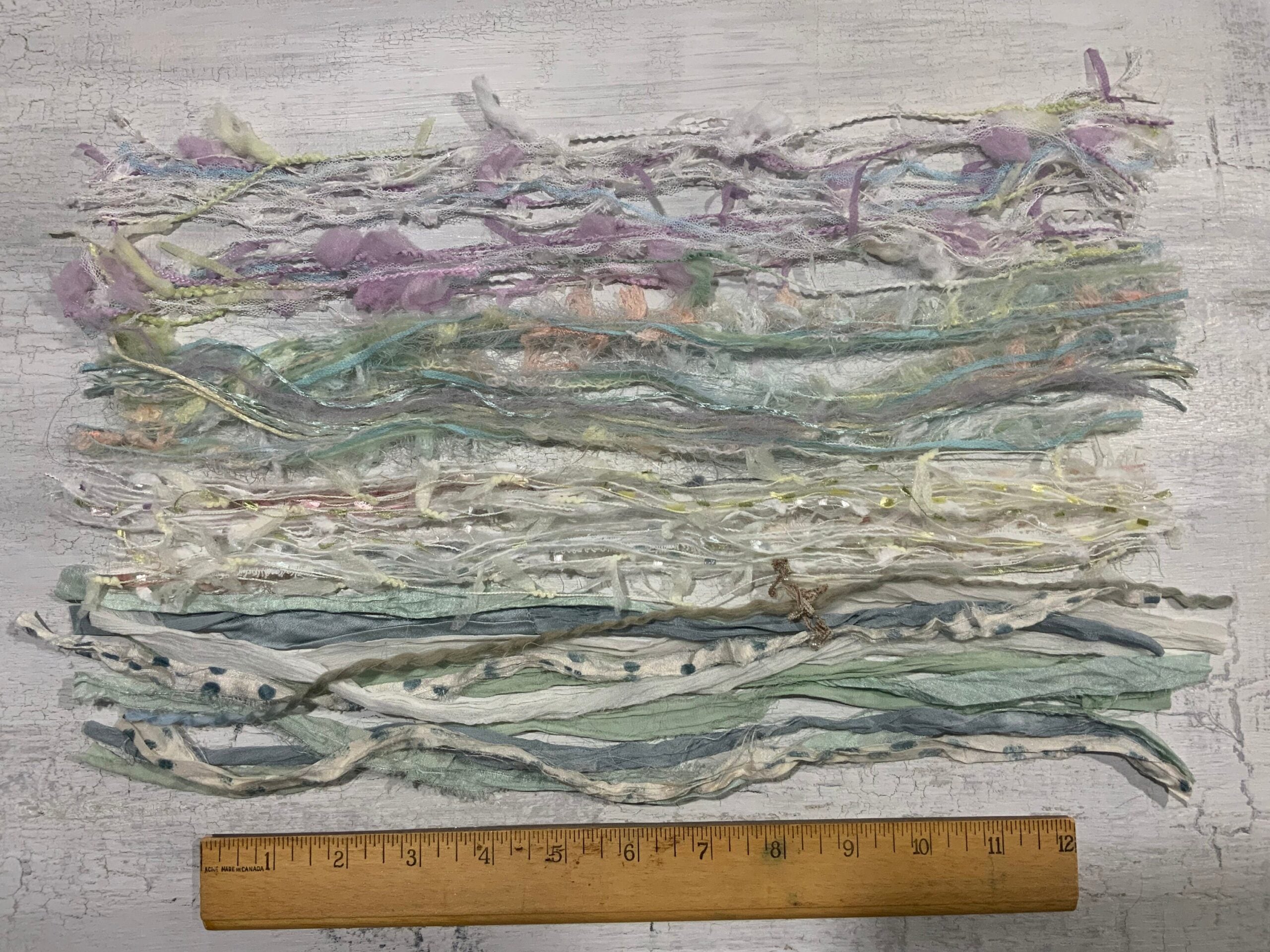Bundle of fancy yarns, silk/chiffon/fabric/crinkled seam binding - already cut to about 15 inches.