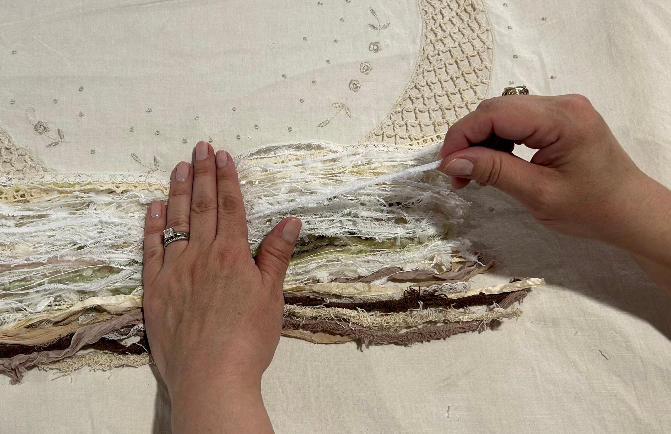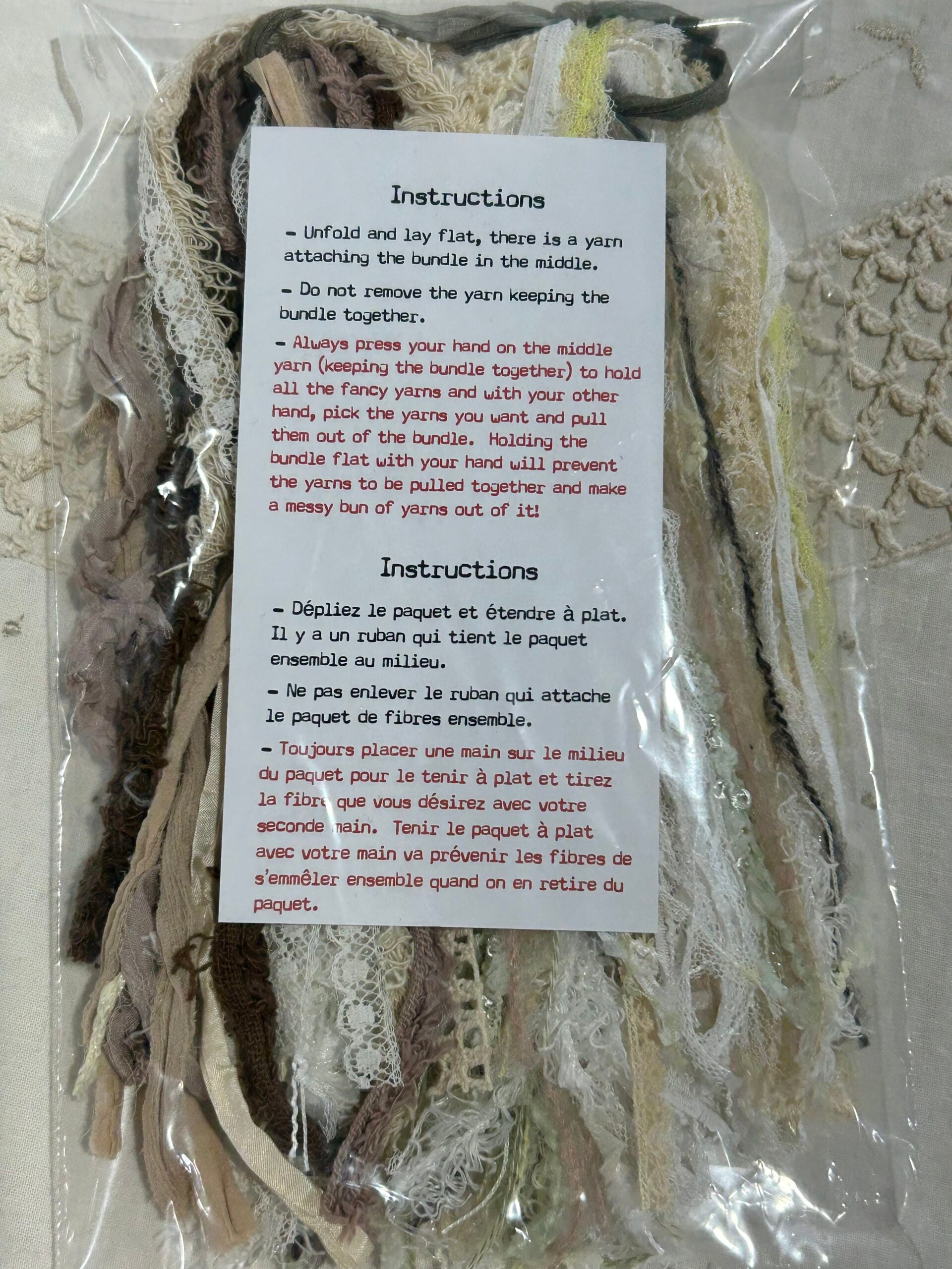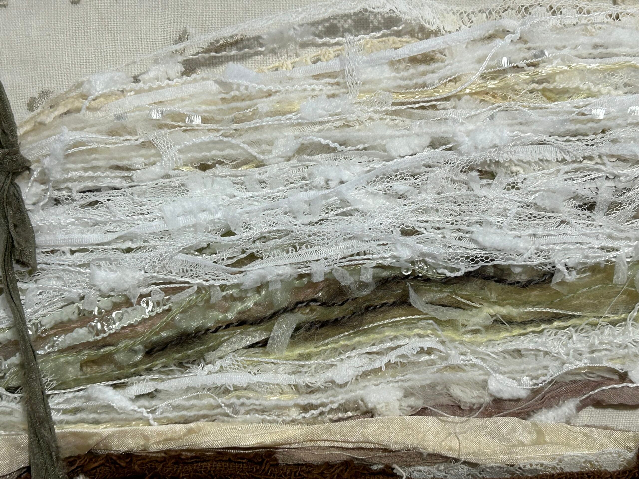 Great mix of neutrals to create tassels, bows, embroidery projects. With that bundle, you will have an interesting choice of yarns, chiffon/sari silk or even vintage thin laces to create with.