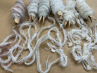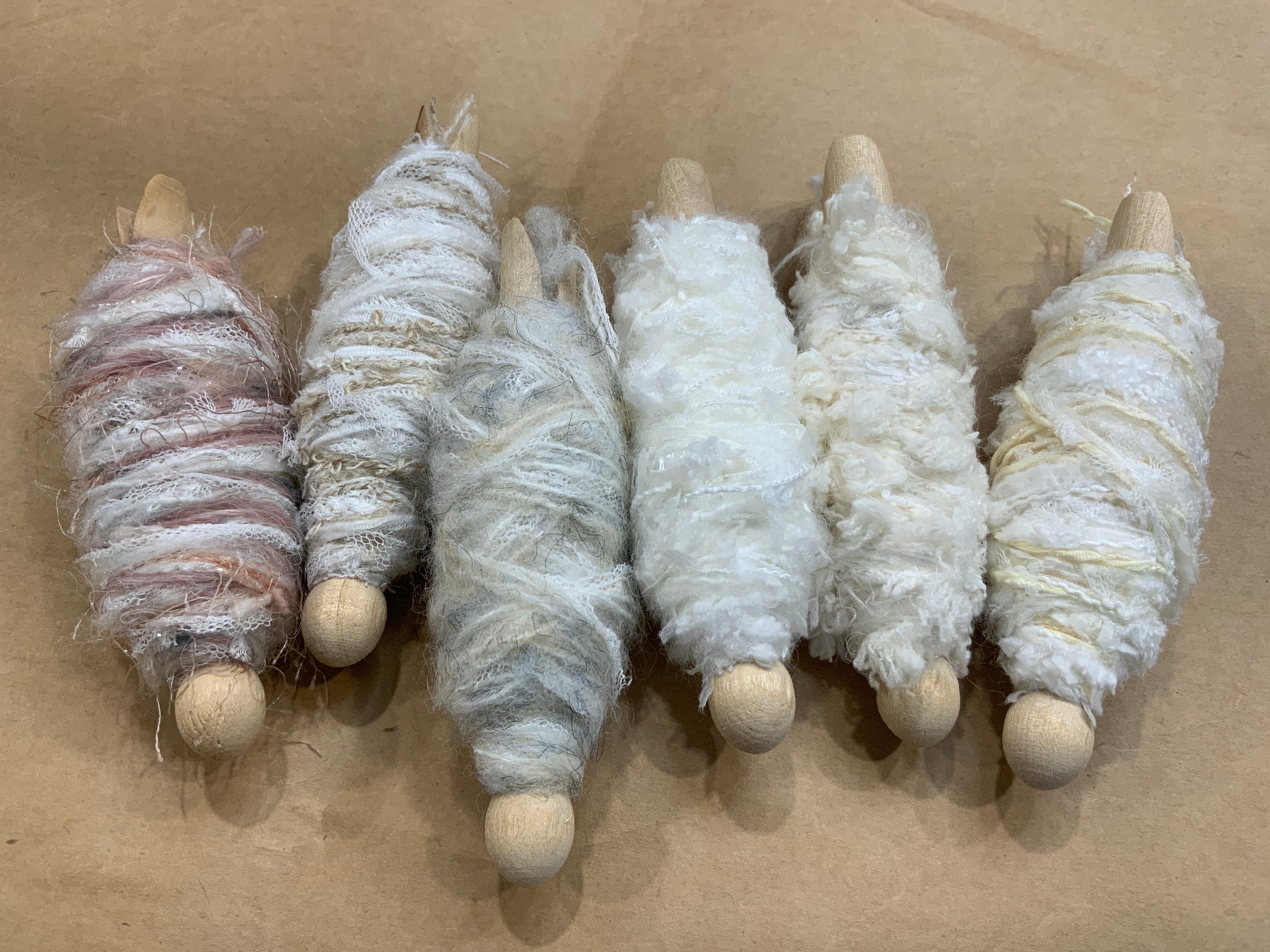 Bundle of 6 fancy yarns rolled around wood pegs.
