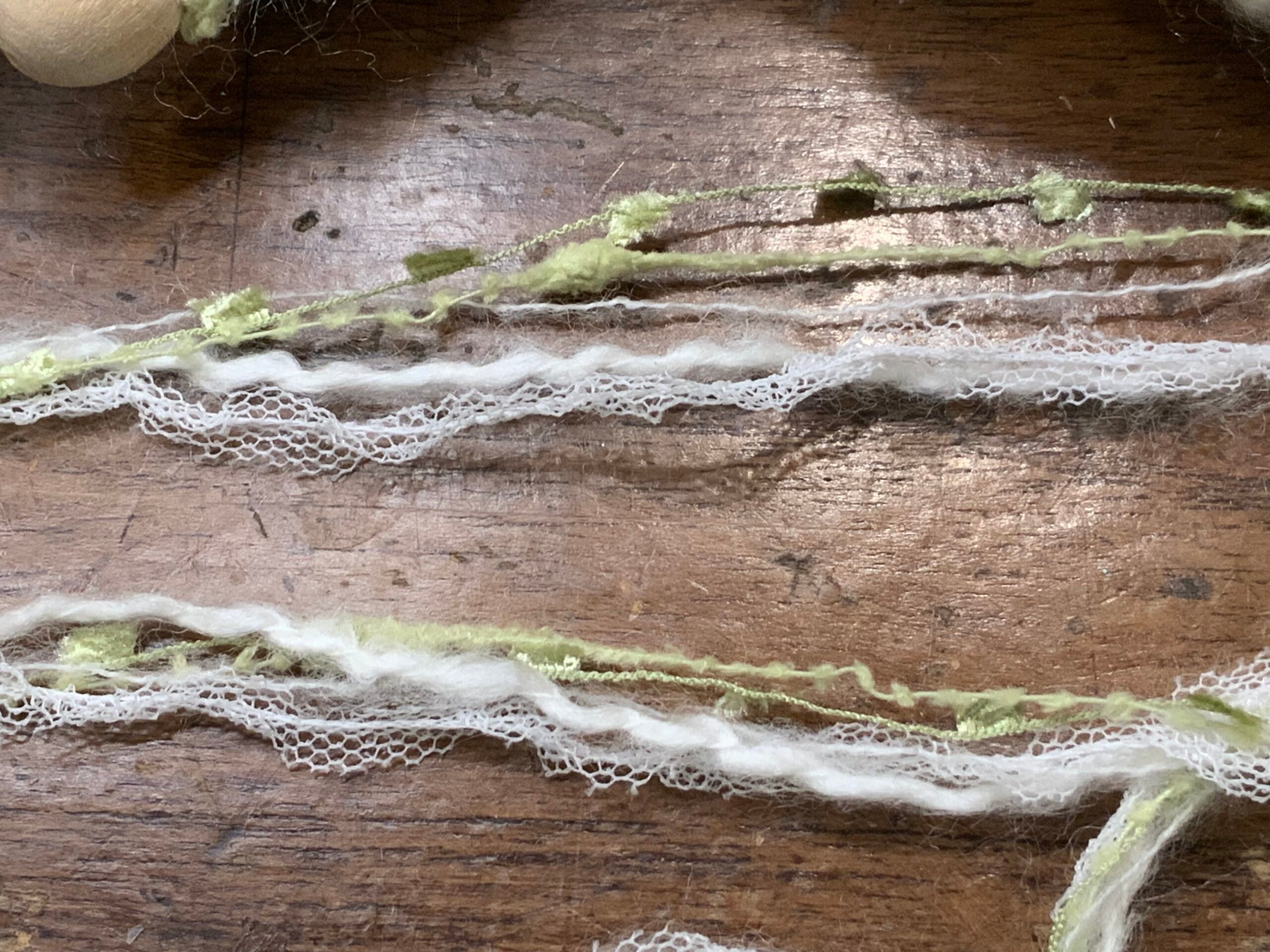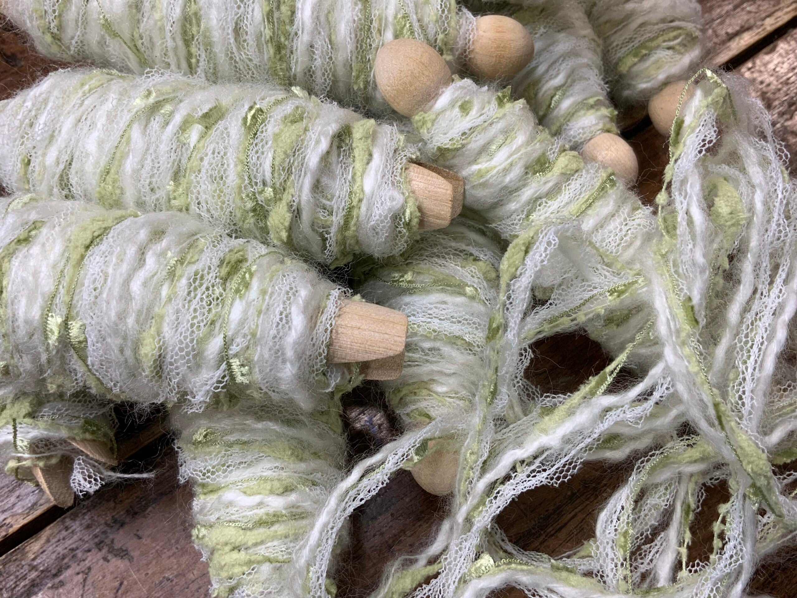 Odulcina mix of fancy yarns rolled around a wood peg or a wood peg.