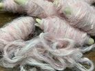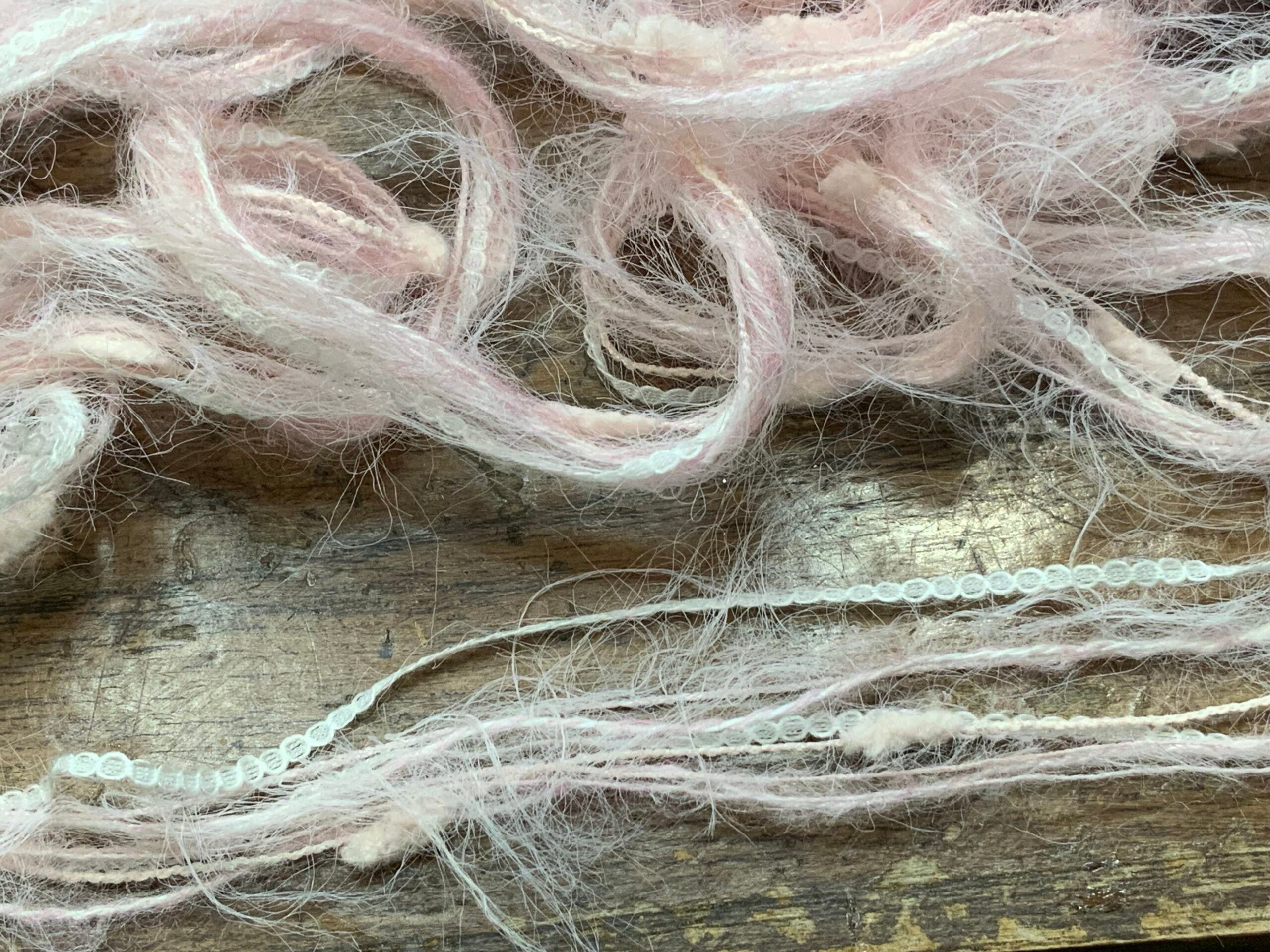 Odulcina mix of fancy yarns rolled around a wood peg or a wood peg.