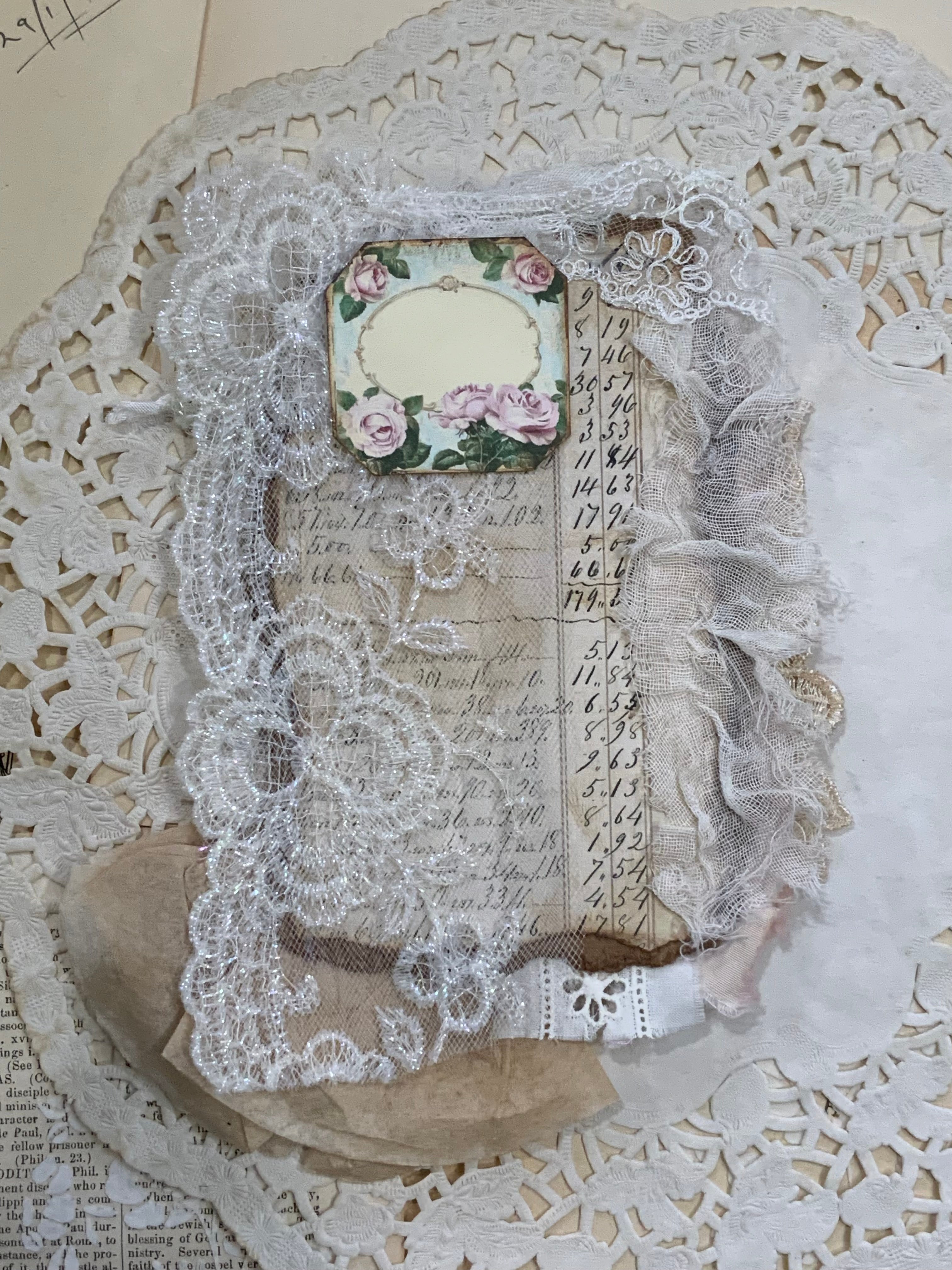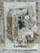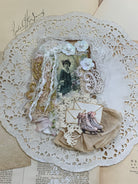 Elegant layers, soft textures, and vintage inspired details make it a beautiful focal point for decorating a journal cover or adding a delicate accent to your creative work.