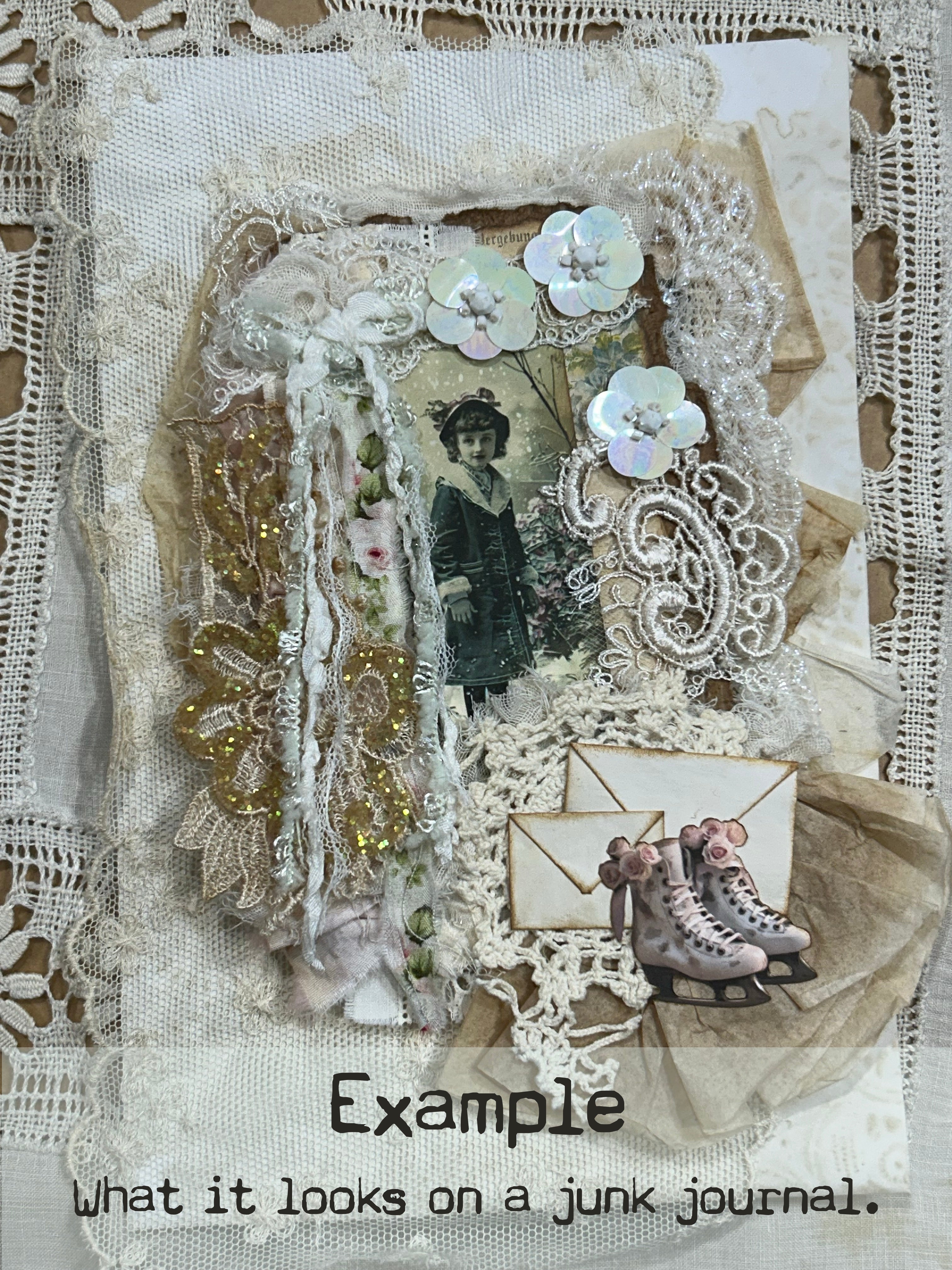 This handmade junk journal ephemera piece, created by Anne, brings a touch of feminine, shabby chic charm to any project.