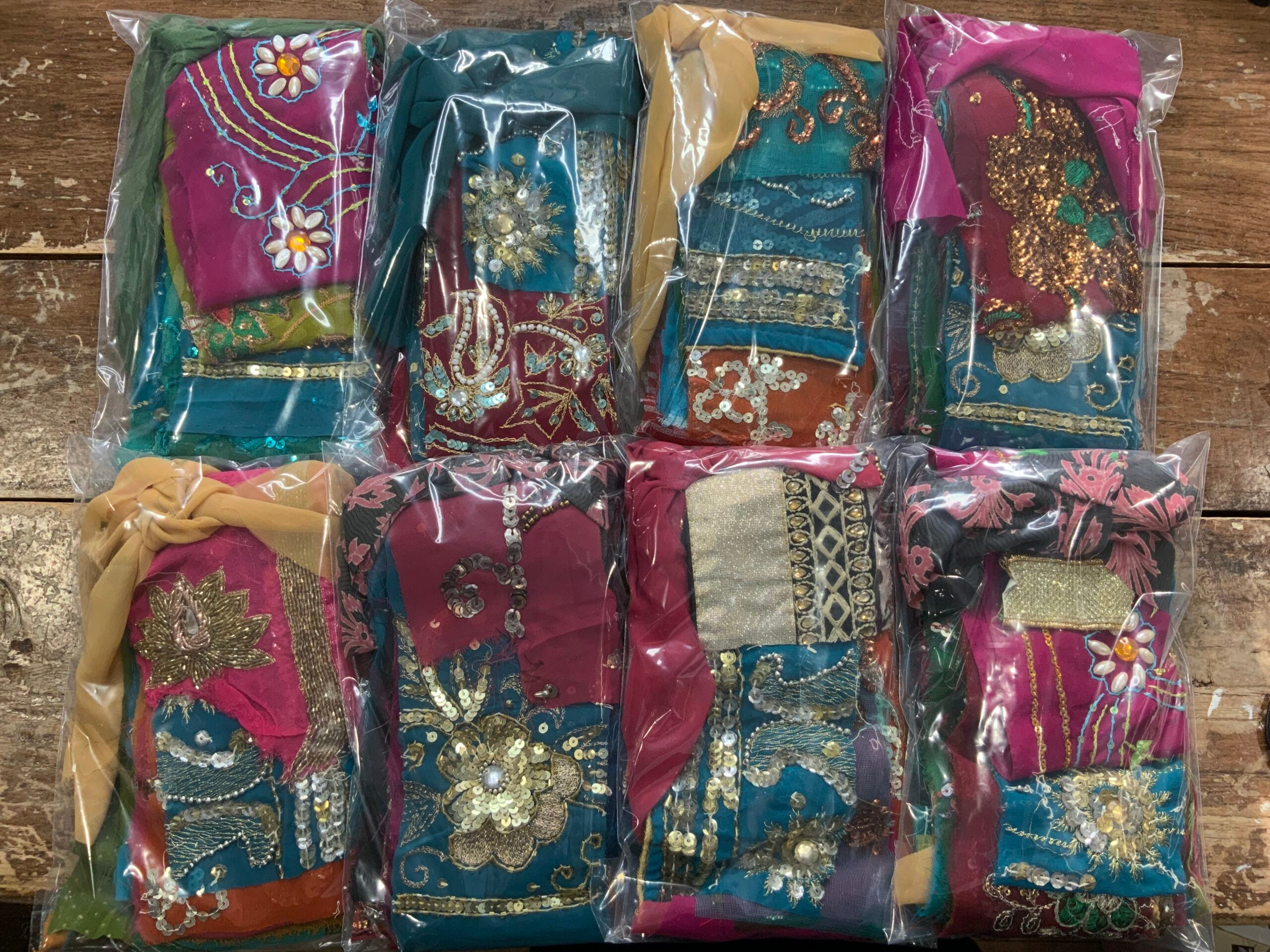 Indian sari scraps, with decorative patterns, embroidered textures and shimmering metallic accents.