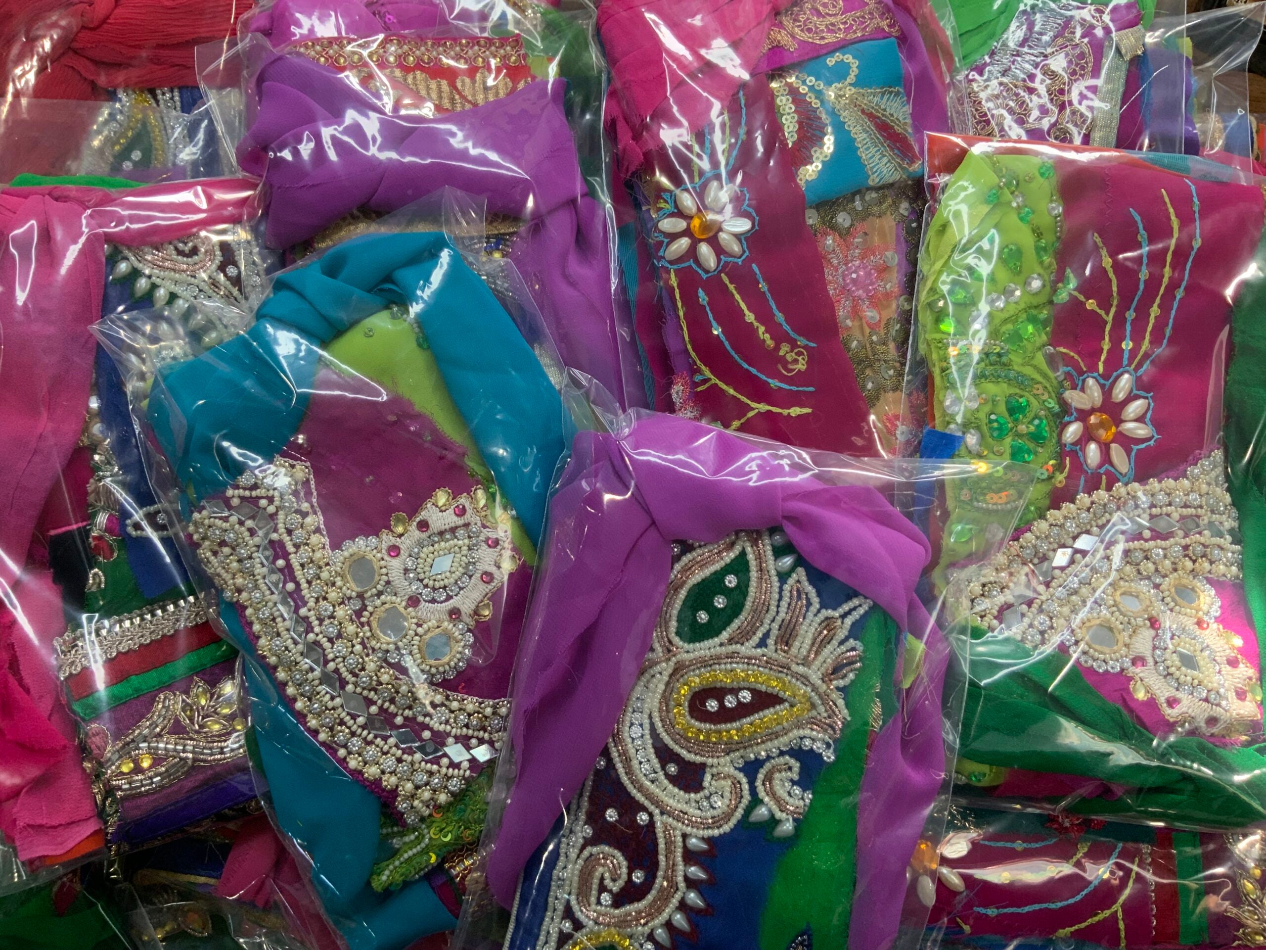 Indian sari scraps, with decorative patterns, embroidered textures and shimmering metallic accents.