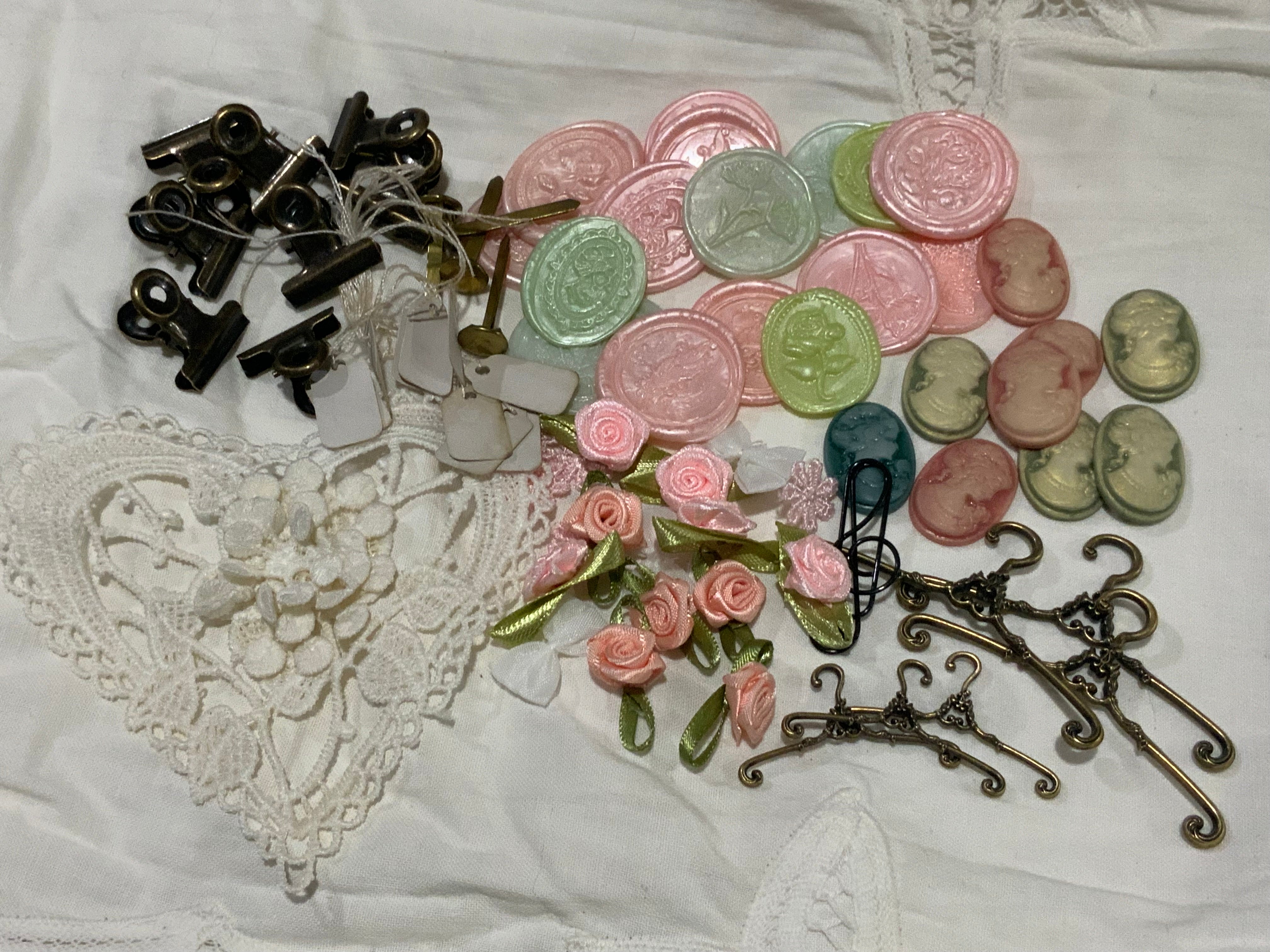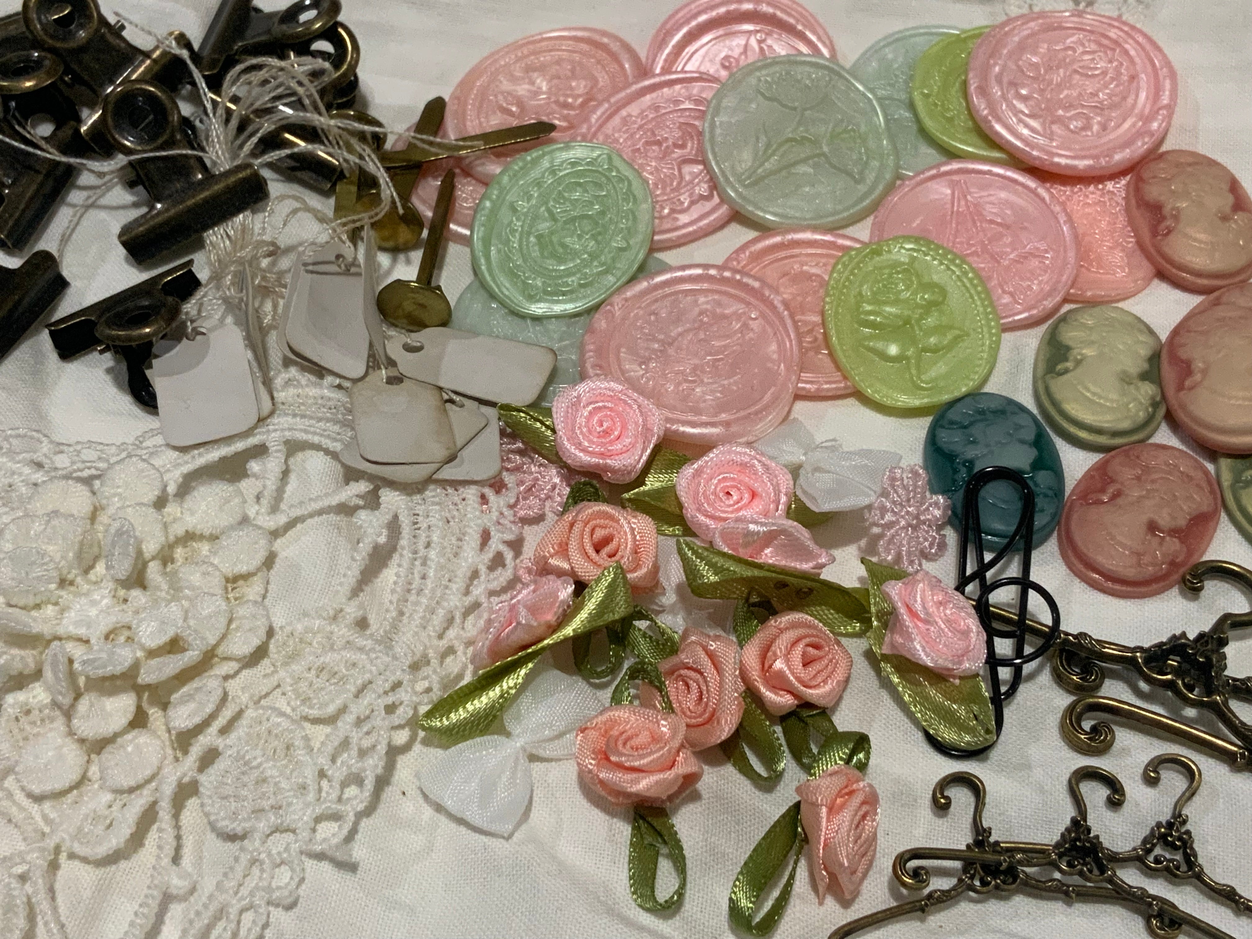 Contient des sceaux de cire faits à la main, des camées de style vintage, des breloques, des fleurs en tissu, des attaches parisiennes vintage, des trombones, appliqué de fleur … Chaque lot est assemblé avec amour, offrant une bonne variété pour stimuler votre créativité.