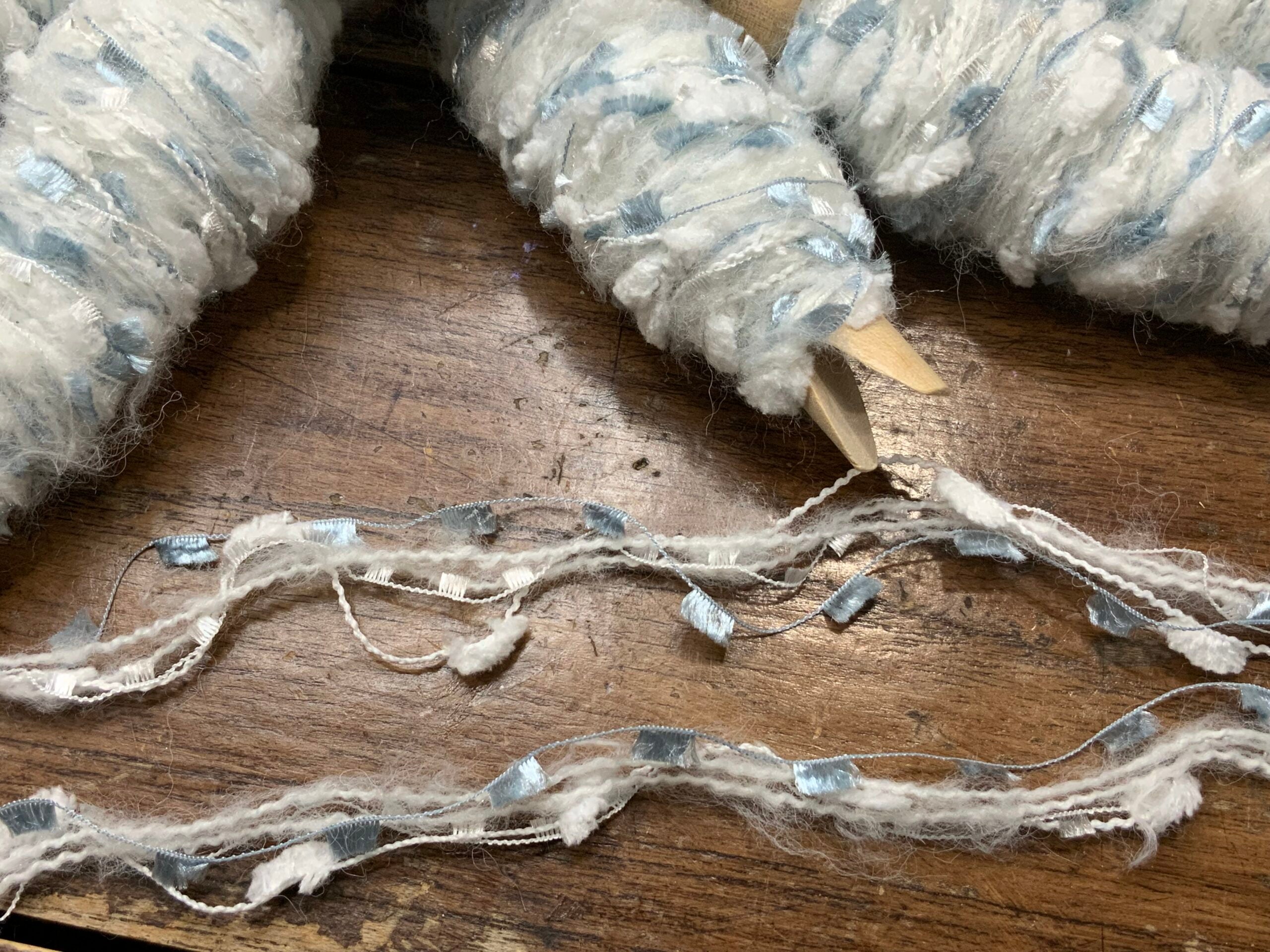 Odulcina mix of fancy yarns rolled around a wood peg or a wood peg.