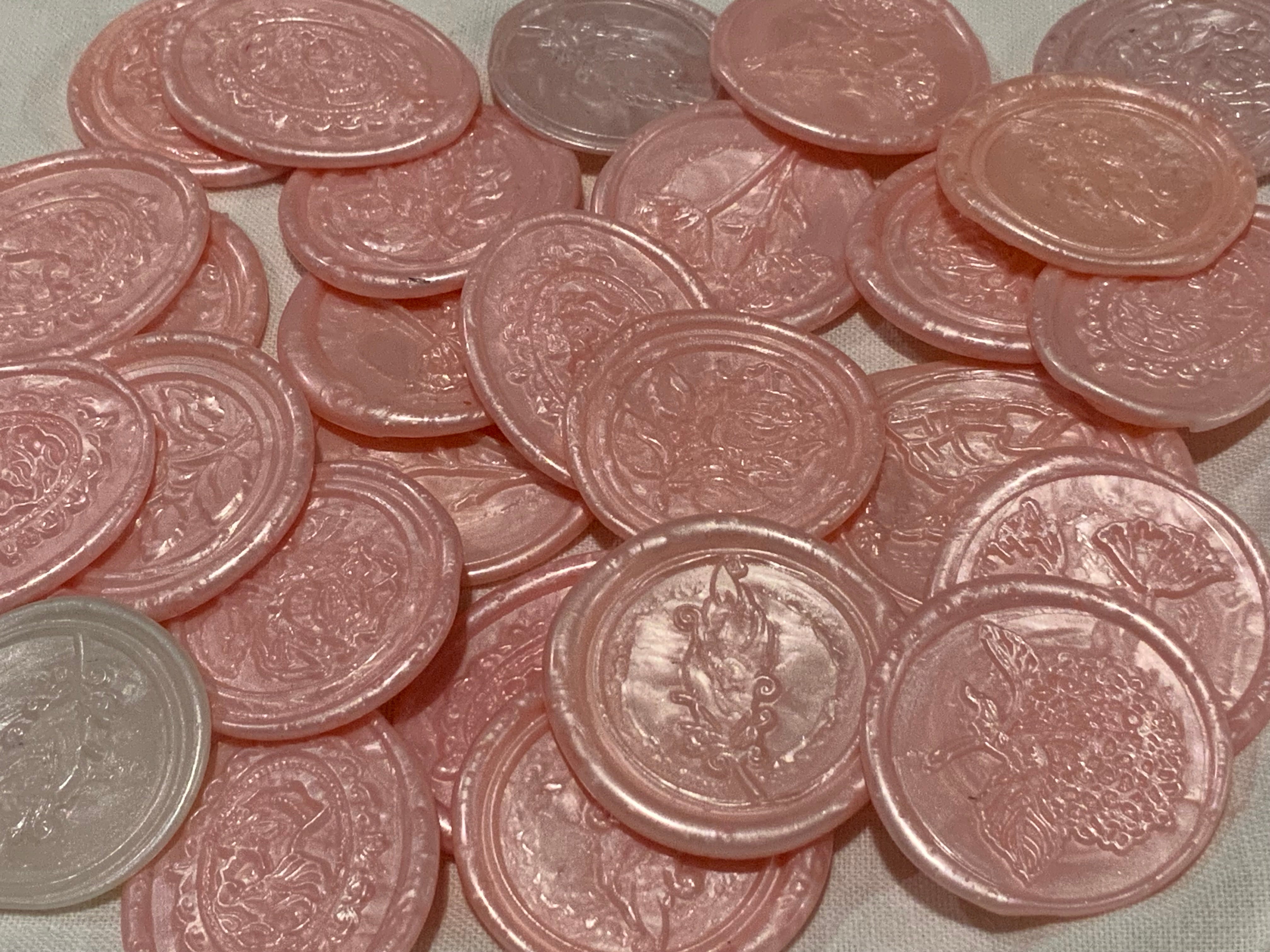 A bundle of 30 handmade wax seals in beautiful shades of pink, featuring a variety of shapes and stamped designs.