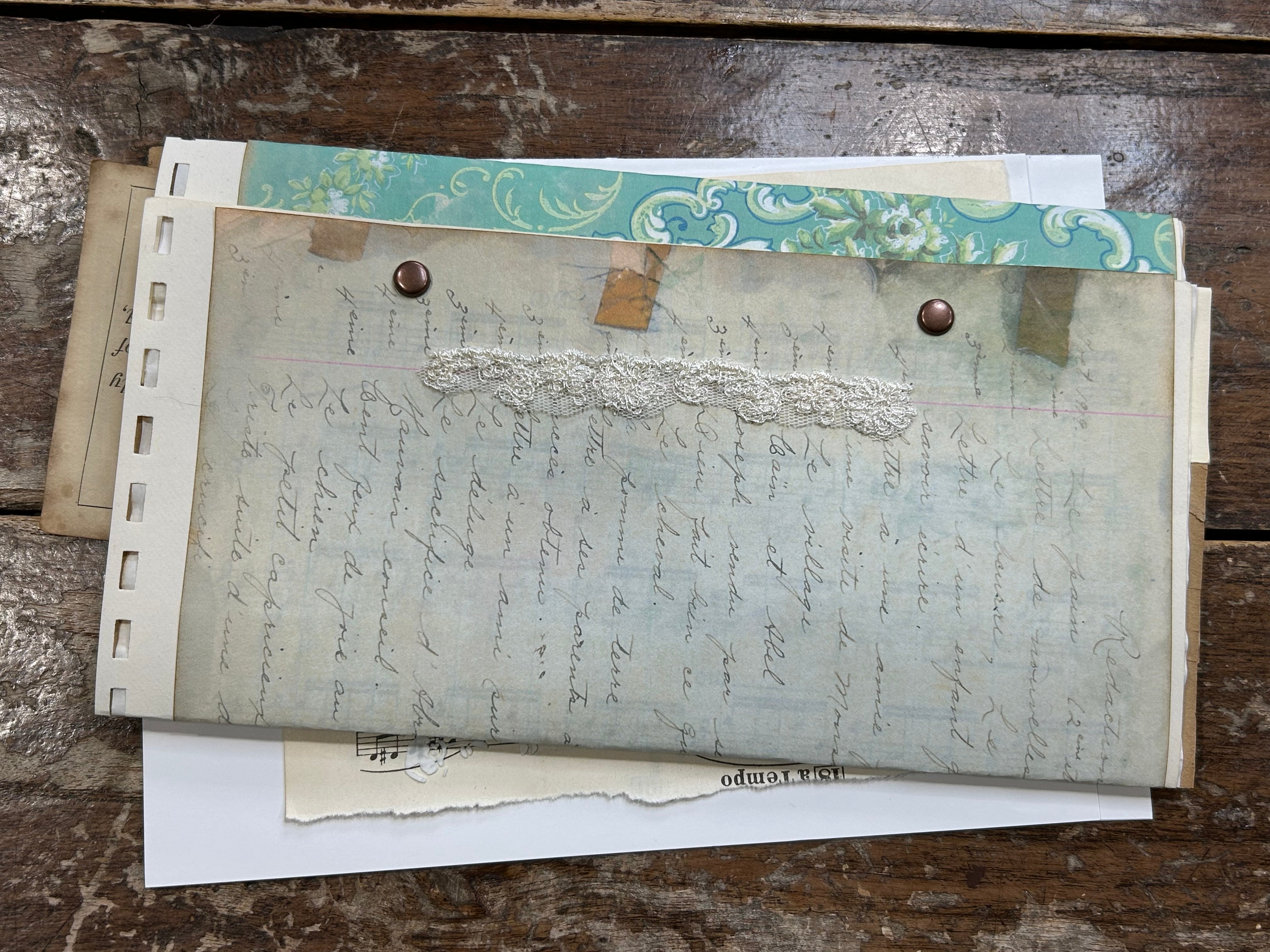 Step back in time with this faux vintage deed, a beautifully assembled collection of authentic antique and vintage papers, decorated with vintage CMS lace, layered and held together with brads for a true old-world feel.